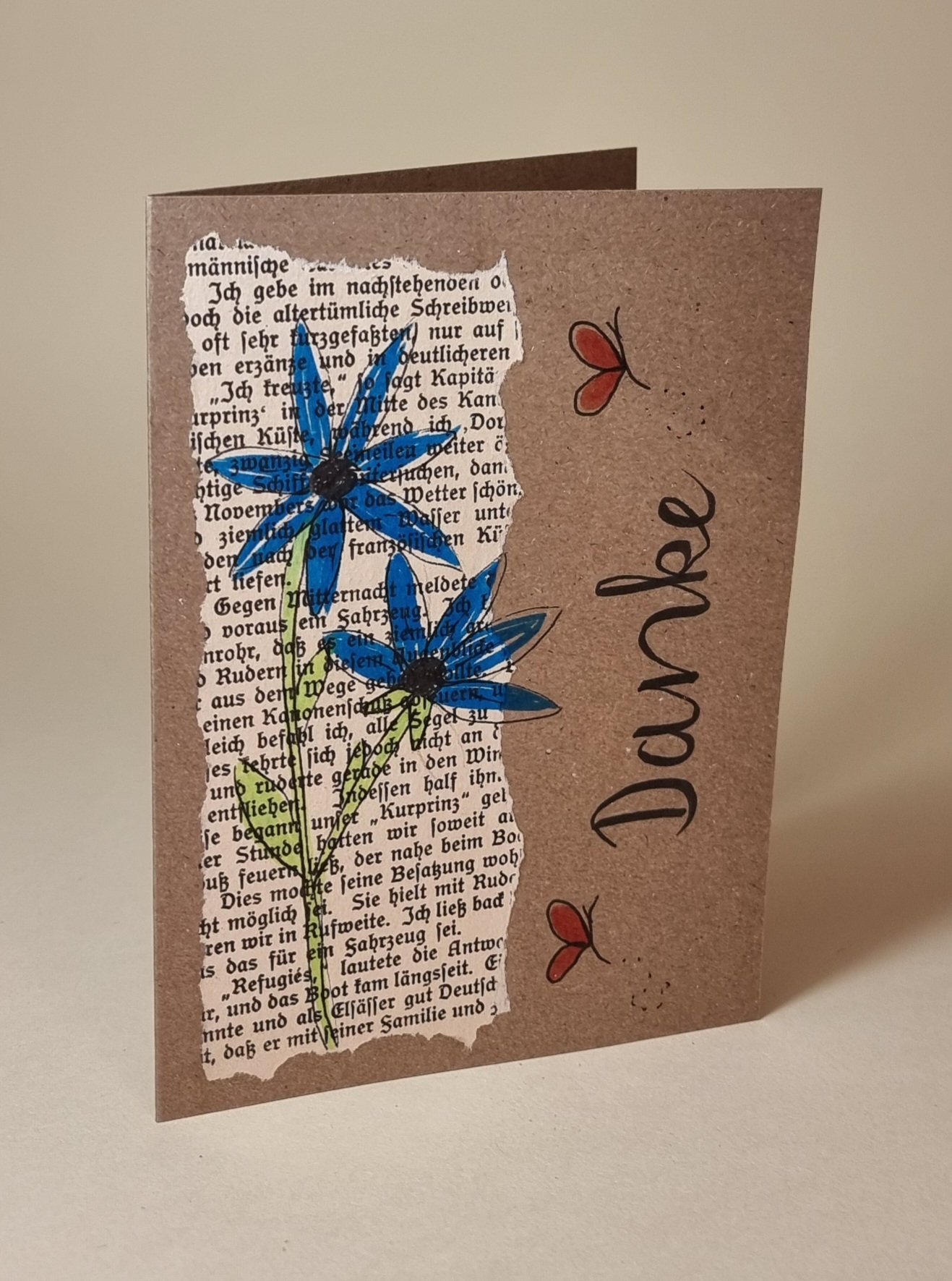Mit einer Karte Danke zu sagen ist wertvoll und persönlich. Dazu ist diese Karte wunderbar geeignet. Die Karte besteht aus einer alten Buchseite mit einer handgemalener Blume und einem Handletteringschriftzug