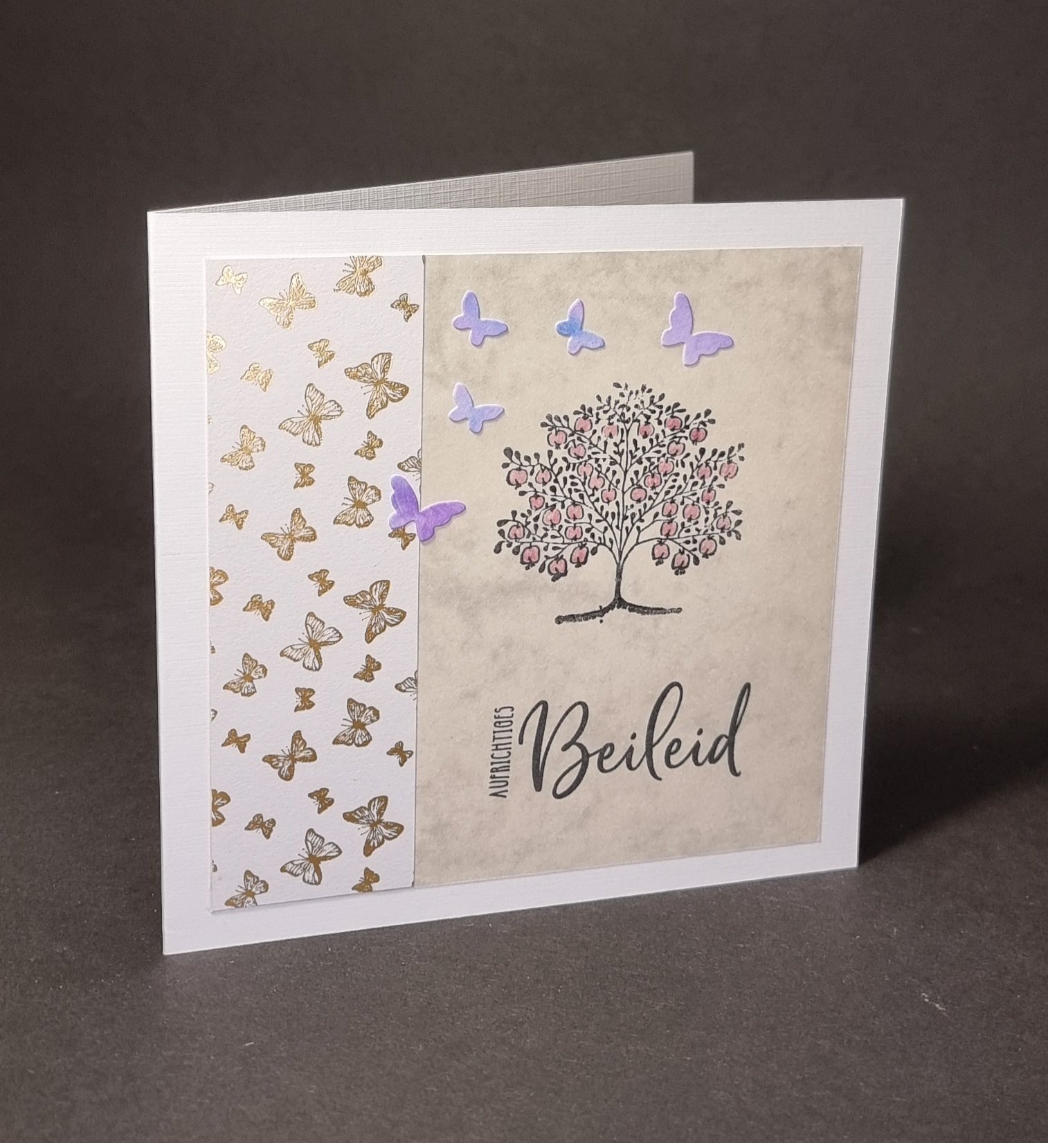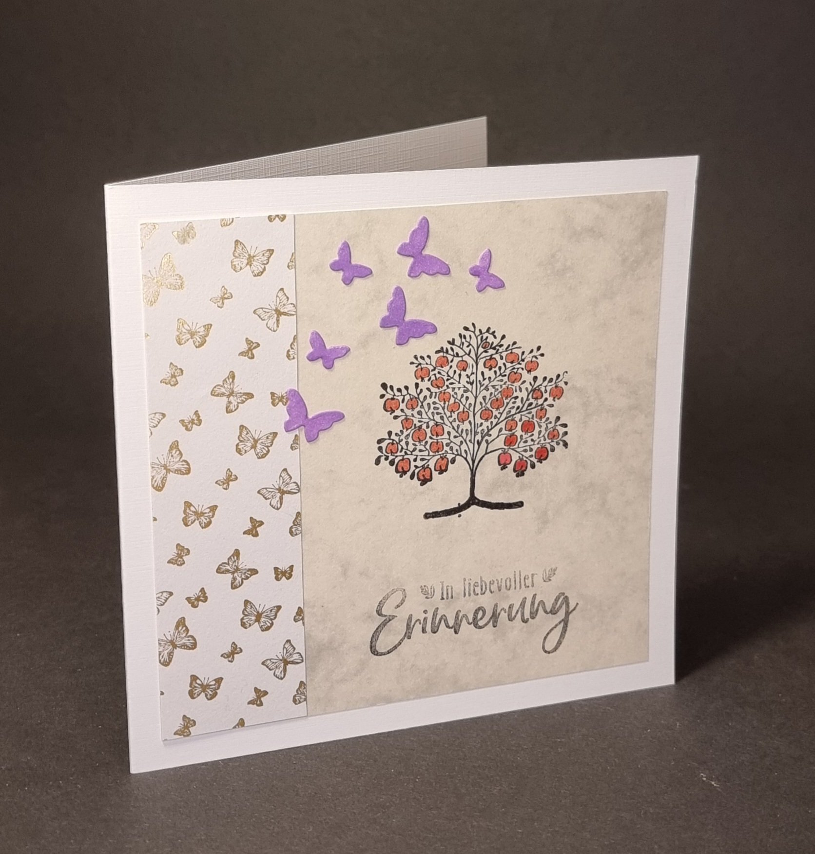 Eine Trauerkarten mit Schmetterlingen und einem Apfelbaum