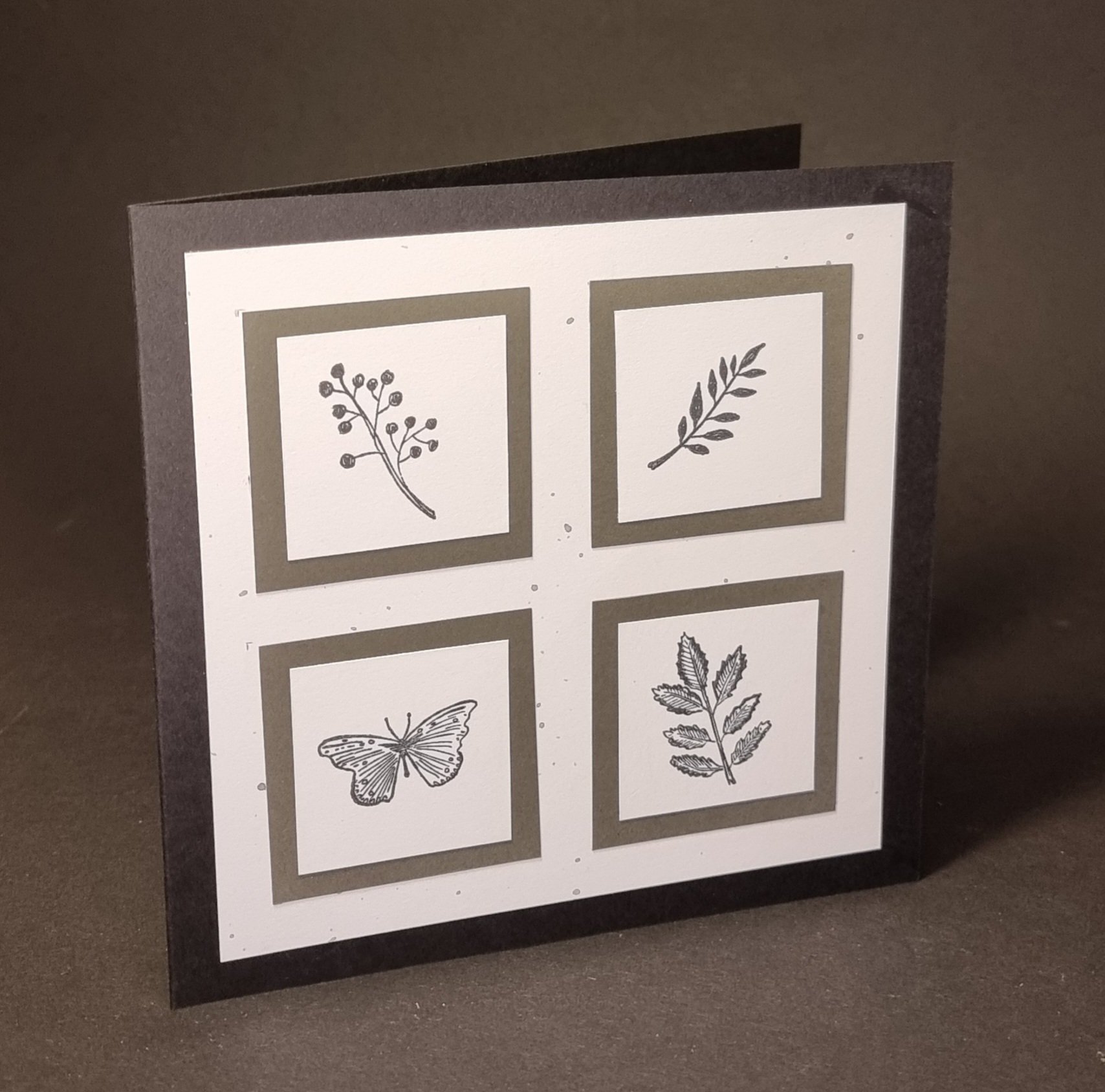 Eine aussergewöhnliche Trauerkarte mit Schmetterling und verschiene Blätter. Kartenformat quadratisch 15x15cm